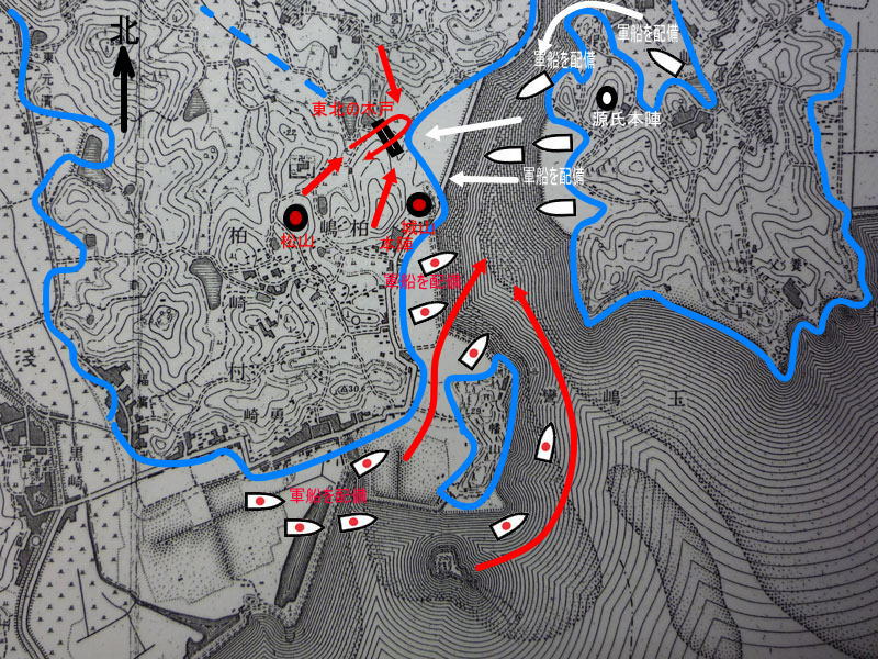 源氏軍の大手の大将は海野弥平四郎行広、搦め手の大将は足利矢田判官代義清であり、五千余人の軍兵が百余艘の軍船のともずなをといて押し出し、夜明けの海を漕ぎ寄せてときの声えをあげた。