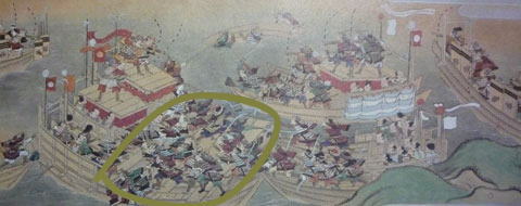 下記の写真は源平水島合戦の模様です。 注目は、赤旗(平氏方)の船は船同士を板で渡して安定を保っている事。 白旗(木曽源氏方)は各船単位なので足場が不安定である。 当日は、海上は非常に時化(しけ)ていた。